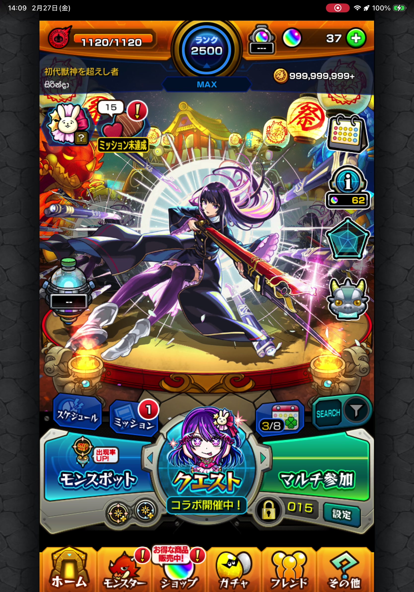 ランク2500に到達しており、スタミナ面や育成面で困ることがほとんどない完成度の高さが強みになる。ガチャ限1589体と運極1719体による厚い手持ちは、どの高難度でもすぐに適正を組めるほどの層の深さがある。平均紋章力20000の数値も実戦に強く、挑戦系のクエストを安定して進めるうえで大きな支えになる。遊び始めた瞬間から制限なく動ける自由度の高さが特徴。