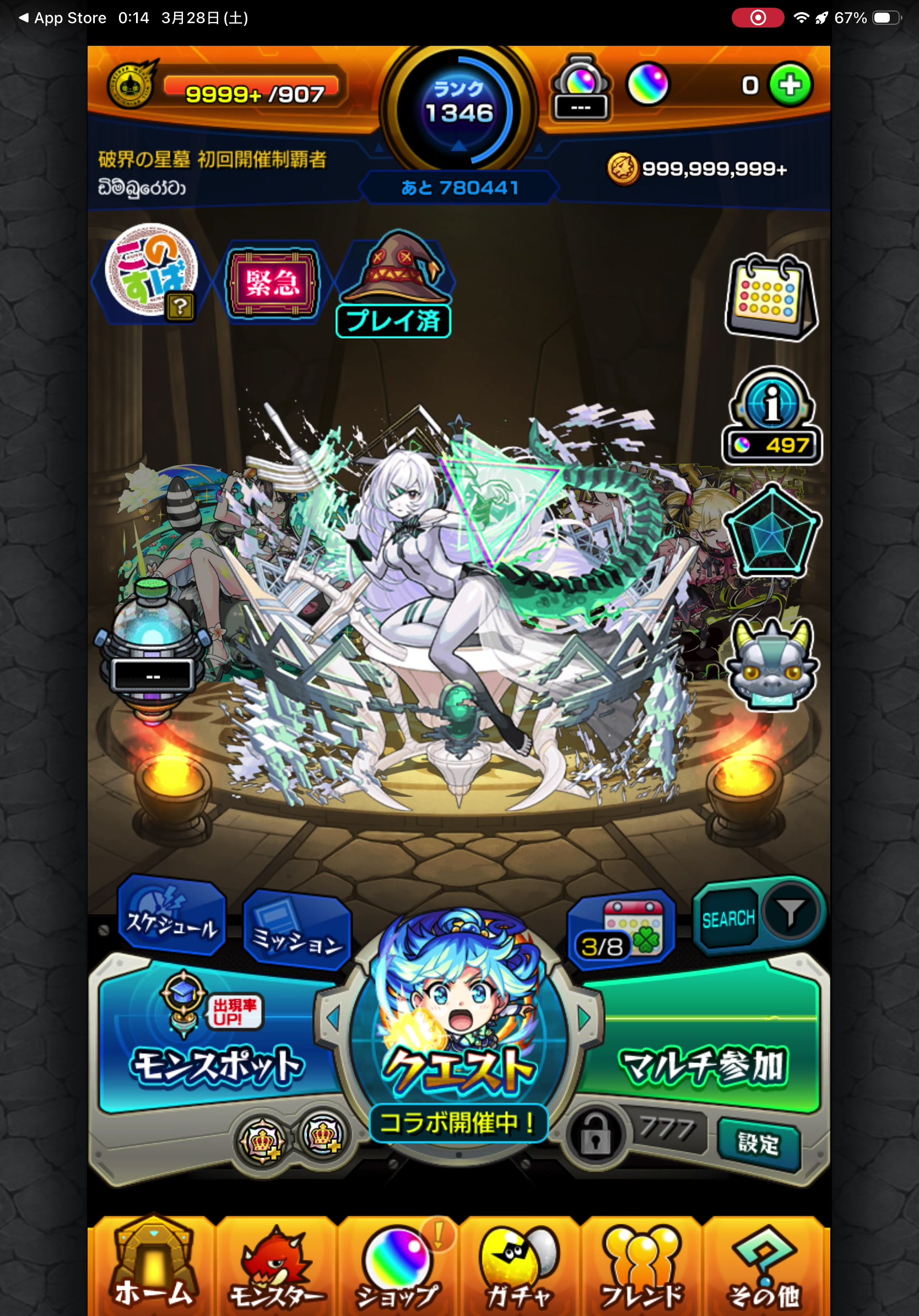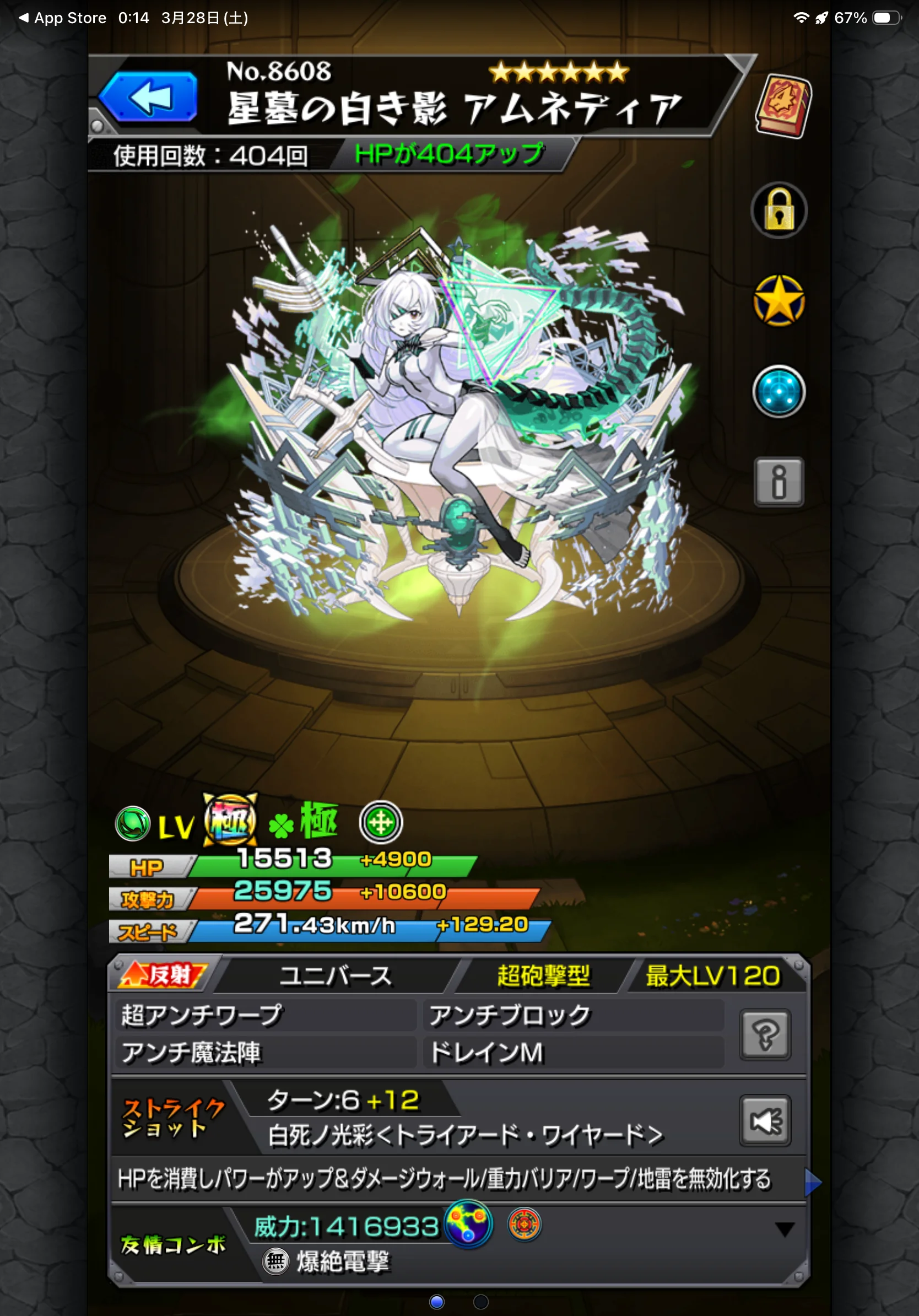 破界の星墓EXクエストからしか入手できない希少キャラ・アムネディアを運極達成しており.星墓初回制覇も達成しており、高難度コンテンツへの取り組みの深さが際立ちます。ランク1346・運極365体・ガチャ限623体と基盤もしっかり整っており、平均紋章力7000とこれから強化を積み上げていける余力も十分残っています。
