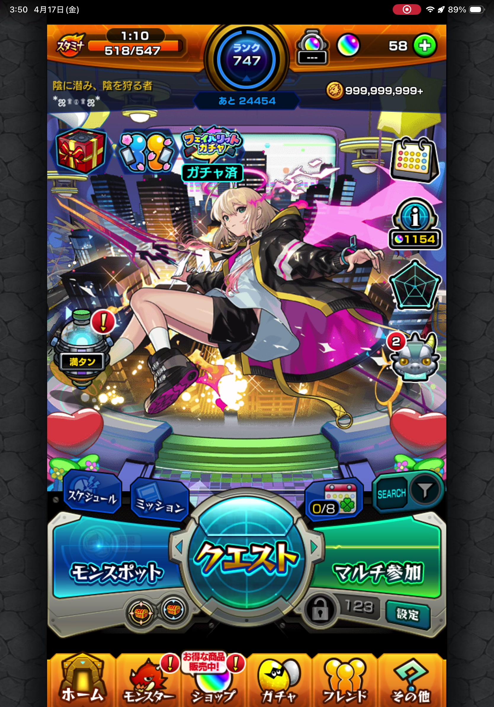 ガチャ限1225体と所持数が非常に充実しており、編成の自由度が高いアカウントです。運極341体と育成も着実に積み上がっており、平均紋章力8000とこれから自分好みに強化を積み上げていける余地が大きく残っています。ランク747とまだ伸びしろも十分あり、ガチャ限の豊富さをベースにこれから育成・強化を楽しみながら成長させていけるアカウントです。
